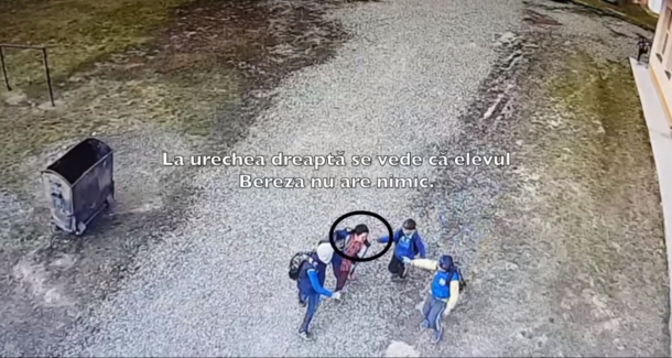 Unul dintre colegii care îl însoțesc arată, imediat după această secvență, cu degetul spre urechea stângă a elevului.