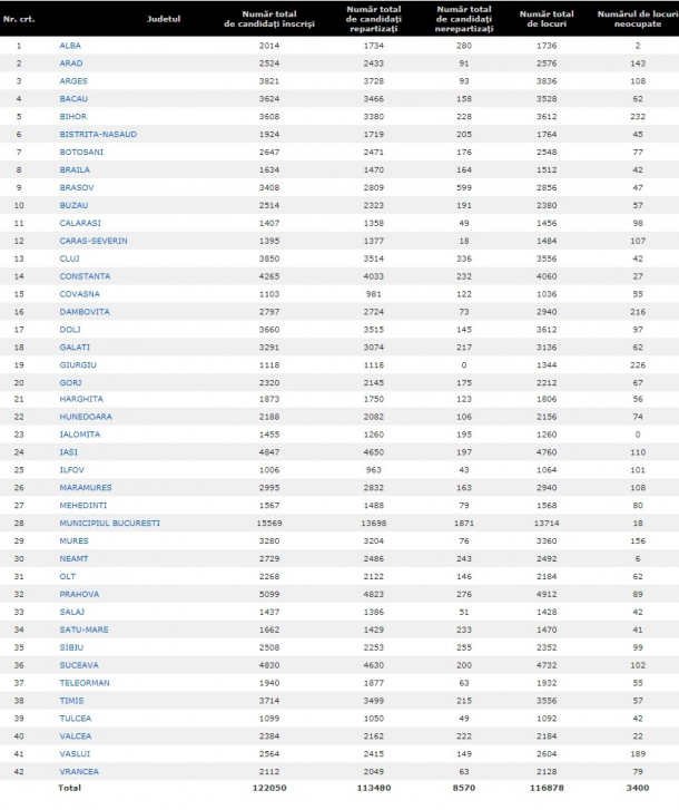 Potrivit datelor publicate pe site-ul de specialitate, din numărul total al candidaților înscriși (122.050 de candidați), au fost repartizați 113.480 de candidați, iar 8.570 nu au fost repartizați.