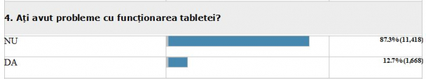 Potrivit rezultatelor, 87.3% (11,418 de persoane) dintre cei chestionați au susținut că nu au avut probleme cu funcționarea tabletei în secția de votare.