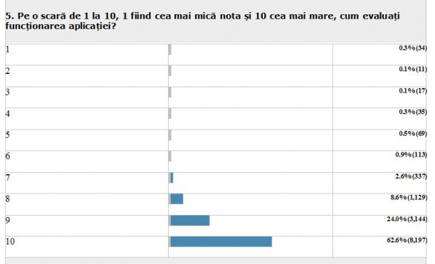 În ceea ce privește modului în care a funcționat aplicația, 62,6% (8.197 de persoane) au dat nota 10, 24,0% (3.144 de persoane) au dat nota 9, iar 8,6% (1.129 de persoane) au dat calificativul 8.