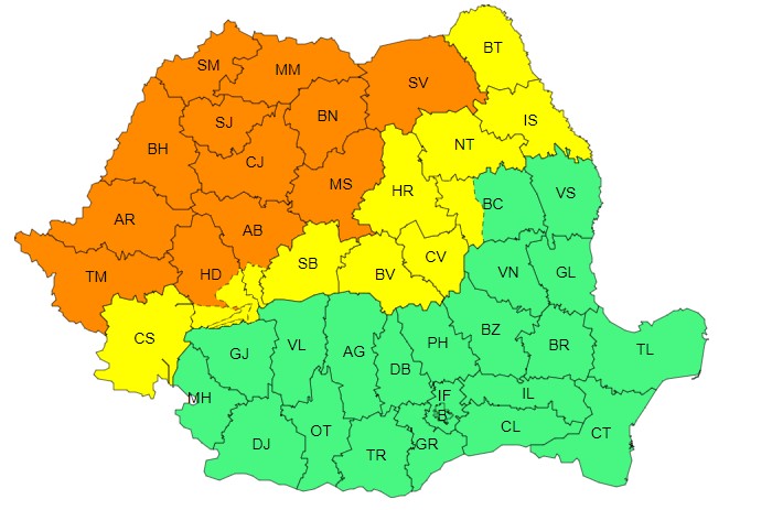 Avertizarea afectează regiuni mai extinse, inclusiv Banat, Crișana, Maramureș, Transilvania, și jumătatea de nord a Moldove.