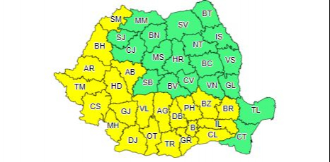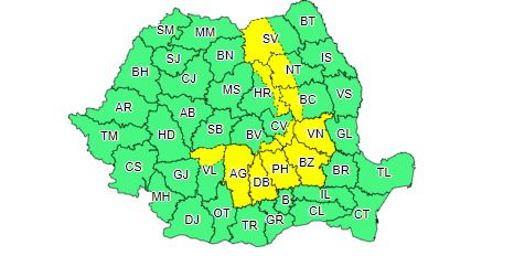 Meteorologii avertizează că, în nordul Munteniei, în sud-vestul Moldovei și în zona Carpaților Orientali și Meridionali, se vor semnala averse torențiale, descărcări electrice și izolat grindină și vijelii. În intervale scurte de timp cantitățile de apă vor depăși local 20…40 l/mp.