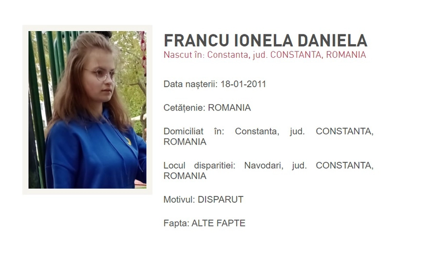 Un mesaj RO-Alert privind dispariția ei a fost emis în Năvodari, județul Constanța. Este vorba despre o fată de 12 ani.