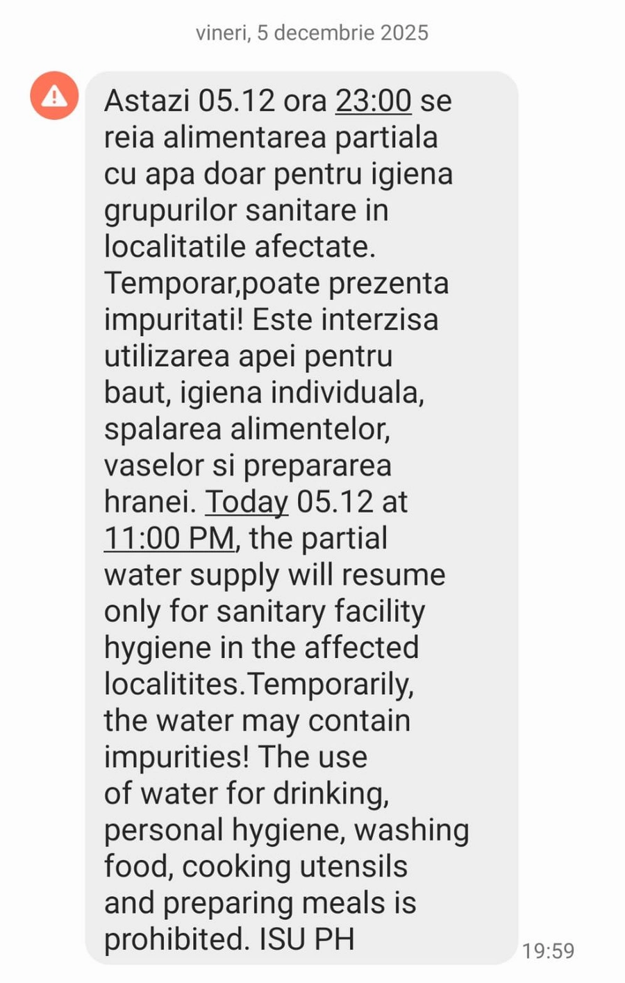 Un mesaj Ro-Alert transmis miercuri seară a precizat că apa furnizată poate prezenta impurități și este destinată strict igienizării grupurilor sanitare: „Este interzisă utilizarea apei pentru băut, igiena individuală, spalarea alimentelor, vaselor și prepararea hranei”.