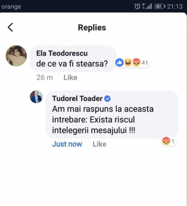 Întrebat, în weekend, de ce şterge postările, Tudorel Toader a răspuns că: „există riscul să fie înţeles mesajul”.