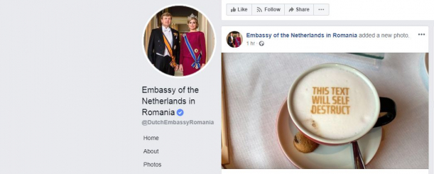 Astfel, Ambasada Olandei au postat pe Facebook o imagine cu o cană de cafea pe care scrie mesajul „Acest text se va autodistruge”.