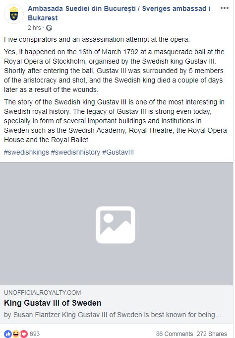 Într-o poveste cu tâlc despre „cinci conspiratori și o tentativă de asasinat la operă”, ambasada a postat pe Facebook despre Regele Gustav III, care a supraviețuit unei tentative de a fi ucis, dar a murit câteva zile mai târziu.