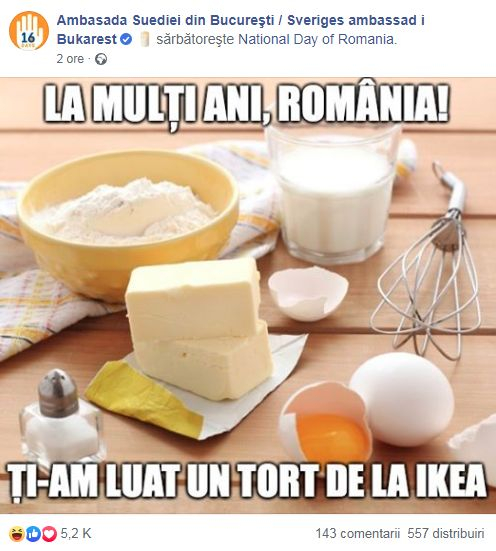 Ambasada Suediei, mesaj amuzant de Ziua Națională: „La mulți ani, România! Ți-am luat un tort…” (FOTO)
