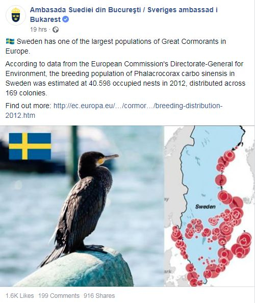 ”Suedia are una dintre cele mai mari populații de mari cormorani din Europa. Potrivit datelor Direcției Generale pentru Mediu a Comisiei Europene, populația de reproducere a Falacrocorax carbo sinensis din Suedia a fost estimată la 40.598 de cuiburi ocupate în 2012, împărțite în 169 de colonii” – se arată într-un mesaj postat pe pagina de Facebook a Ambasadei Suediei.