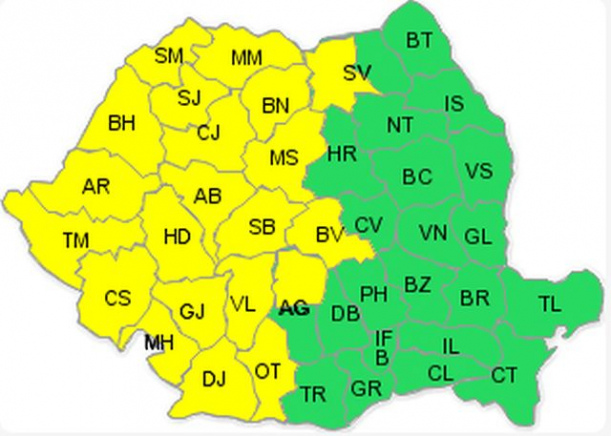 Judeţele Alba, Argeş, Arad, Bihor, Bistriţa-Năsăud, Braşov, Cluj, Caraş-Severin, Dolj, Gorj, Hunedoara, Mehedinţi, Maramureş, Mureş, Olt, Sibiu, Sălaj, Satu Mare, Suceava, Timiş şi Vâlcea vor fi sub avertizare cod galben de vineri, ora 08.00, până duminică, la ora 10.00.