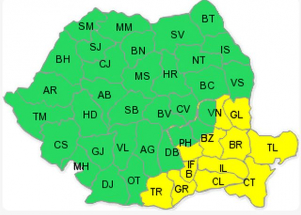 Totodată, meteorologii anunță că Bucureştiul şi 12 judeţe din estul şi sud-estul ţării (Ilfov, Brăila, Buzău, Călăraşi, Constanţa, Galaţi, Giurgiu, Ialomiţa, Prahova, Tulcea, Teleormanşi Vrancea) vor fi, vineri şi sâmbătă, sub avertizare cod galben de caniculă şi disconfort termic, temperaturile în aceste zone ajungând la 37 de grade.