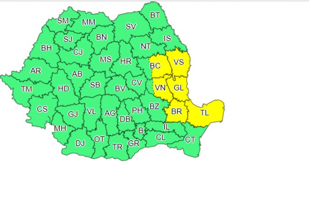 Potrivit Administrației Naționale de Meteorologie, în Muntenia, Dobrogea, jumătatea de sud a Moldovei, estul și sud-esul Transilvaniei și local în Carpații Orientali și Meridionali, instabilitatea atmosferică va fi temporar accentuată și se va manifesta prin averse ce vor avea și caracter torențial, descărcări electrice, intensificări ale vântului, cu viteze de peste 65…75 km/h, vijelii și grindină. Cantitățile de apă vor depăși 25…30 l/mp și izolat 40 l/mp.