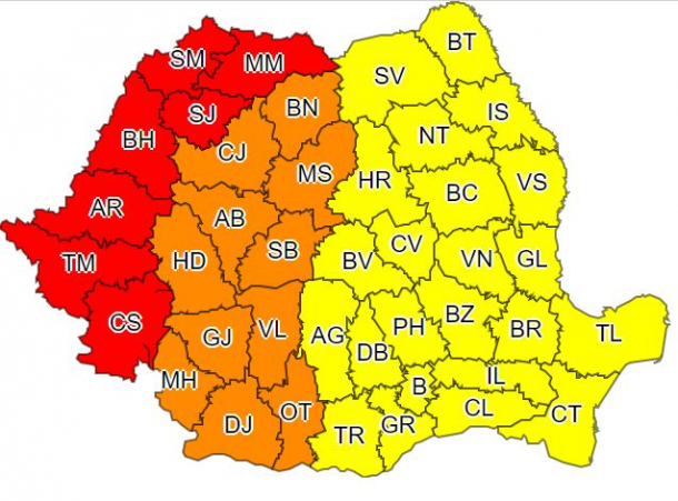 În sud-vestul și centrul țării, valul de căldură se va intensifica, va fi caniculă și disconfort termic accentuat. Se vor înregistra temperaturi maxime cuprinse frecvent între 37 și 39 de grade în Oltenia și între 35…37 de grade în cea mai mare parte a Transilvaniei. Valorile nocturne nu vor coborî, în general, sub 20…22 de grade. Județele vizate sunt Dolj, Olt, Mehedinți, Gorj, Vâlcea, Sibiu, Hunedoara, Alba, Mureș, Cluj și Bistrița Năsăud.