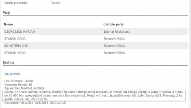 Antena 3 şi jurnalista Oana Stancu au pierdut definitiv procesul cu Marian Georgescu, tatăl preşedintelui ANI