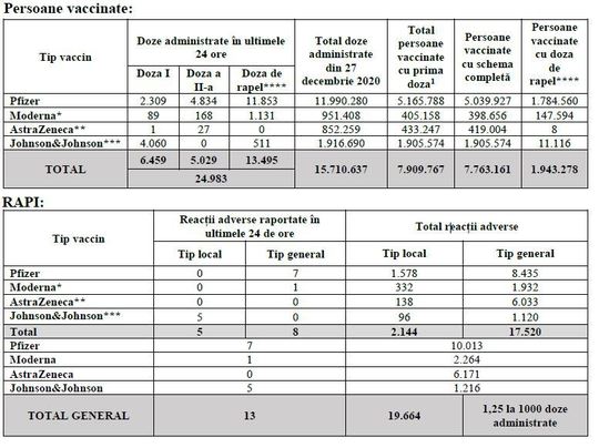 În total, de la începutul campaniei de vaccinare, în România au fost imunizate 7.909.767 de persoane, iar 7.763.161 au primit schema completă, 1.943.278 de persoane au fost vaccinate cu doza a treia.