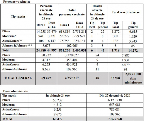 Potrivit celui mai recent bilanț prezentat de Comitetul Național de Coordonare a Activităților privind Vaccinarea împotriva COVID-19 (CNCAV), în ultima zi au fost vaccinate 69.477 de persoane, 24.480 cu prima doză și 44.997 cu rapel. Majoritatea, 50.237, au ales vaccinul produs de Pfizer.