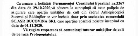În urma înființării firmei de asigurări, toate polițele care aparițin unităților de cult din Arhiepiscopia Sucevei și Rădăuților se vor face prin firma SC ASR Bucovina SRL, scrie Bucovina News.