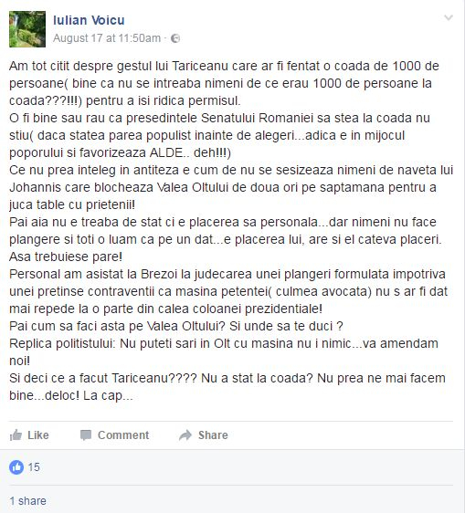 "Am tot citit despre gestul lui Tariceanu care ar fi fentat o coada de 1000 de persoane( bine ca nu se intreaba nimeni de ce erau 1000 de persoane la coada???!!!) pentru a isi ridica permisul.