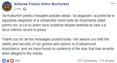 „Va mulțumim pentru mesajele postate astăzi. Va asigurăm că protecția și siguranță oaspeților și a vizitatorilor noștri este de importantă vitală pentru noi, și că nu avem nicio evidență despre șederea la care s-a făcut referire recent în presă”, este mesajul transmis de Athenee Palace, pe Facebook.