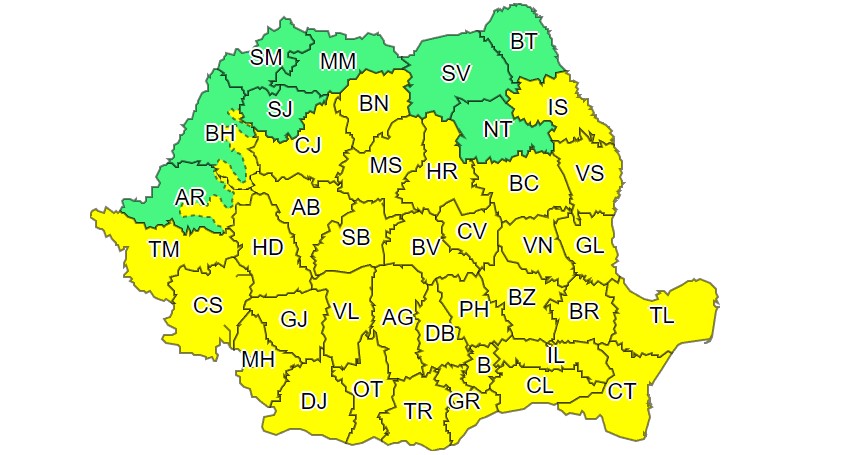 Judeţele aflate sub avertizare sunt: Alba, Argeş, Arad, Bacău, Bihor, Bistriţa-Năsăud, Brăila, Braşov, Buzău, Cluj, Călăraşi, Caraş-Severin, Constanţa, Covasna, Dâmboviţa, Dolj, Gorj, Galaţi, Giurgiu, Hunedoara, Harghita, Ialomiţa, Iaşi, Mehedinţi, Mureş, Olt, Prahova, Sibiu, Tulcea, Timiş, Teleorman, Vâlcea, Vrancea, Vaslui şi Municipiul Bucureşti.