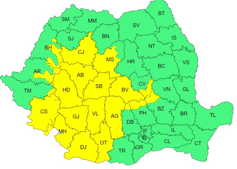Avertizările meteorologice sunt valabile în județele: Cluj, Alba, Sibiu, Brașov, Hunedoara, Vâlcea, Argeș, Caraș-Severin, Gorj, Mehedinți, Dolj și Olt. De asemenea, parțial vor fi afectate județele Mureș, Covasna, Buzău, Prahova, Dâmbovița, Bihor, Arad și Timiș.