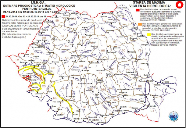 Astfel, Institutul de Hidrologie a emis Cod galben de inundații în intervalul 24.10.2014 ora 12:00 – 25.10.2014 ora 16:00 pe râurile din bazinele hidrografice: Bega-sector aval Balinţ, Timiş, Caraş superior şi mijlociu, Nera (judeţele Timiş şi Caraş Severin), Jiu pe sector Filiaşi-Podari (judeţul Dolj) şi pe afluentul său Motru (judeţele Gorj şi Mehedinţi).