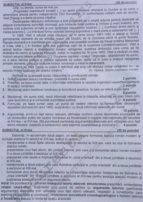 La Istorie, primul subiect a conținut un text din Gheorghe Gheorghiu Dej, urmat de mai multe cerințe. La subiectul II, elevii au avut de făcut o analiză pe un text ce avea ca subiect conflictul dintre Vlad Țepeș și Imperiul Otoman. Cel de a al treilea subiect a presupus realizarea unui eseu pornind de la perioada modernă a României, începând cu domnia lui Alexandru Ioan Cuza vizând măsurile destinate modernizării statului român în contextul politic extern.
