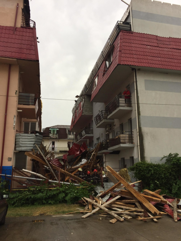 O furtună violentă a smuls acoperişul unui bloc din Baia Mare. În cădere, structura a fisurat o țeavă de gaz şi a lovit un bărbat.