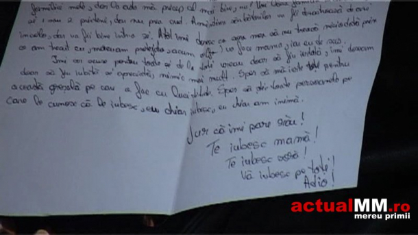 Jur că îmi pare rău! Te iubesc mamă! Te iubesc soră! Vă iubesc pe toți! Adio!”