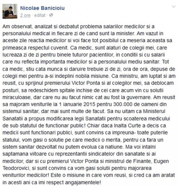 „Am observat, analizat si dezbatut problema salariilor medicilor si a personalului medical in fiecare zi de cand sunt la minister. Am văzut în aceste zile reacția medicilor și voi face tot posibilul că meseria aceasta să primească respectul cuvenit. Ca medic, sunt alături de colegii mei, care lucrează zi de zi pentru binele tuturor pacienților, în condiții și cu salarii care nu reflectă importanța medicilor și a personalului mediu sanitar. Tot ca medic, știu câtă muncă și dăruire trebuie zi de zi, ora de oră, depuse de colegii mei pentru a-și îndeplini nobila misiune. Ca ministru, am luptat și am reușit, cu sprijinul premierului Victor Ponta și al colegilor mei, să deblocăm posturi, să redeschidem spitale închise de cei care acum vin cu soluții miraculoase, dar care nu au făcut nimic cât au fost la guvernare. Am reușit să majorăm veniturile la 1 ianuarie 2015 pentru 300.000 de oameni din sistemul sanitar, dar mai sunt multe de făcut. Să nu uităm că Ministerul Sănătății a propus modificarea legii Sănătății pentru scoaterea medicului de sub statutul de funcționar public! Chiar dacă Înalta Curte a decis că medicii sunt funcționari publici, sunt convins că împreună — toate puterile statului — vom găsi o soluție pe care medicii o merită, pentru că fără un sistem sanitar dezvoltat nu putem evolua ca națiune. Mă voi întâlni săptămâna viitoare cu reprezentanții sindicatelor din sănătate și ai medicilor, dar și cu premierul Victor Ponta și ministrul de Finanțe, Eugen Teodorovici, și sunt convins că vom găsi soluții pentru majorarea veniturilor medicilor! Este o misiune în care vom reuși și cred că am arătat în acești ani că îmi respect angajamentele!”, a scris ministrul Sănătății pe rețeaua de socializare.
