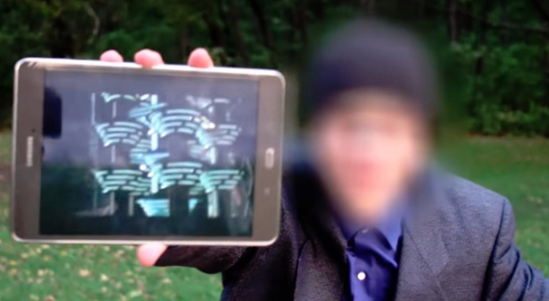 Drept „dovadă”, el arată spre cameră o tabletă cu nişte ”fimări din 2045”, care par mai curând imagini dintr-un joc PlayStation 2.