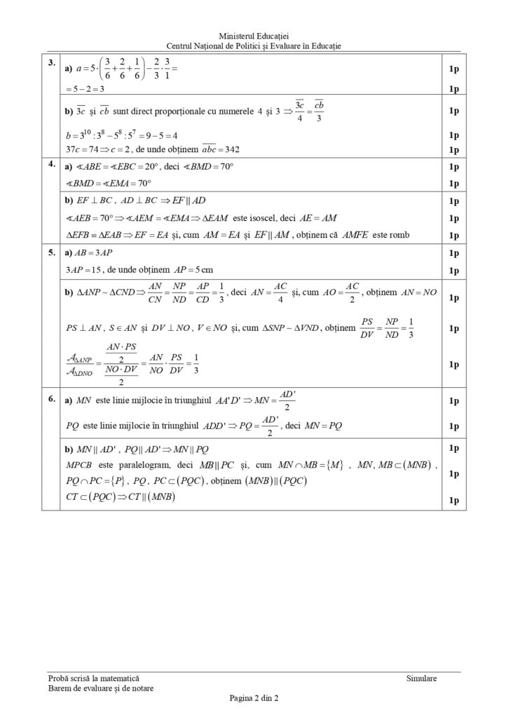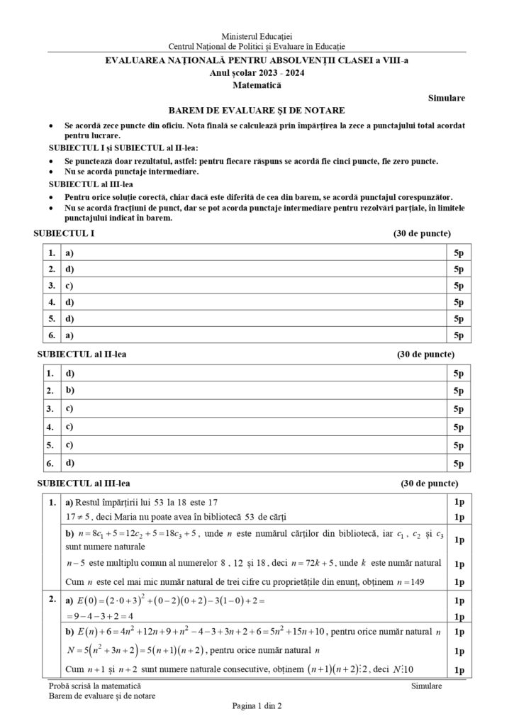 Baremele de corectare și notare pentru Matematică, simularea Evaluării Naționale 2024