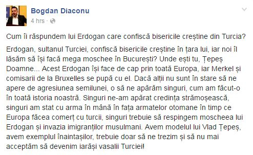 Erdogan, sultanul Turciei, confiscă bisericile creștine în țara lui, iar noi îl lăsăm să își facă mega moschee în București? Unde ești tu, Țepeș Doamne… Acest Erdogan își face de cap prin toată Europa, iar Merkel și comisarii de la Bruxelles se pupă cu el. Dacă alții nu sunt în stare să ne apere de agresiunea semilunei, o să ne apărăm singuri, cum am făcut-o în toată istoria noastră. Singuri ne-am apărat credința strămoșească, singuri am stat cu arma în mână în fața armatelor otomane în timp ce Europa făcea comerț cu turcii, singuri trebuie să respingem moscheea lui Erdogan și invazia imigranților musulmani. Avem modelul lui Vlad Țepeș, avem exemplul înaintașilor, trebuie doar să ne trezim și să nu mai acceptăm să devenim iarăși vasalii Turciei!", a scris Diaconu despre Ergodan și acțiunile acestuia din urmă împotriva bisericilor creștine din Turcia.