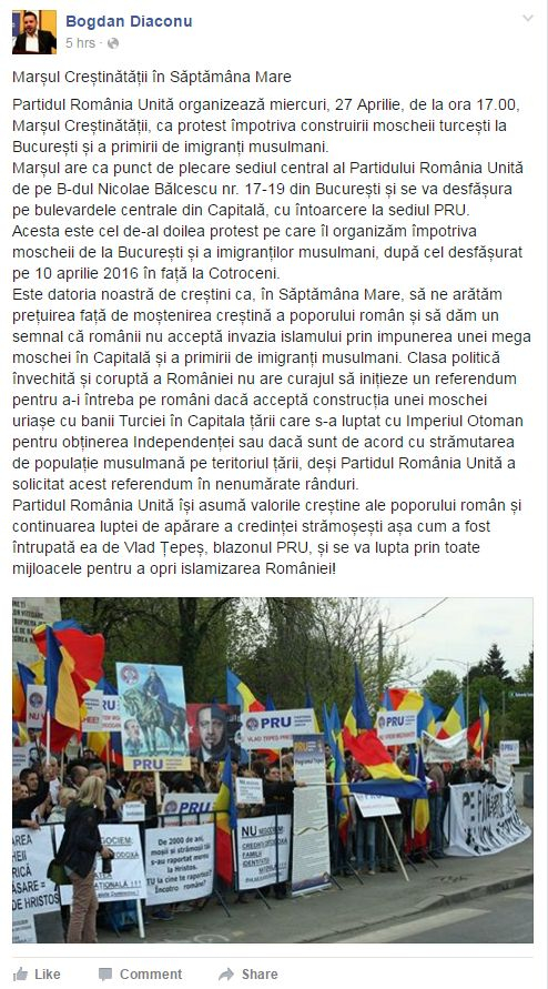 Este datoria noastră de creștini ca, în Săptămâna Mare, să ne arătăm prețuirea față de moștenirea creștină a poporului român și să dăm un semnal că românii nu acceptă invazia islamului prin impunerea unei mega moschei în Capitală și a primirii de imigranți musulmani. Clasa politică învechită și coruptă a României nu are curajul să inițieze un referendum pentru a-i întreba pe români dacă acceptă construcția unei moschei uriașe cu banii Turciei în Capitala țării care s-a luptat cu Imperiul Otoman pentru obținerea Independenței sau dacă sunt de acord cu strămutarea de populație musulmană pe teritoriul țării, deși Partidul România Unită a solicitat acest referendum în nenumărate rânduri.