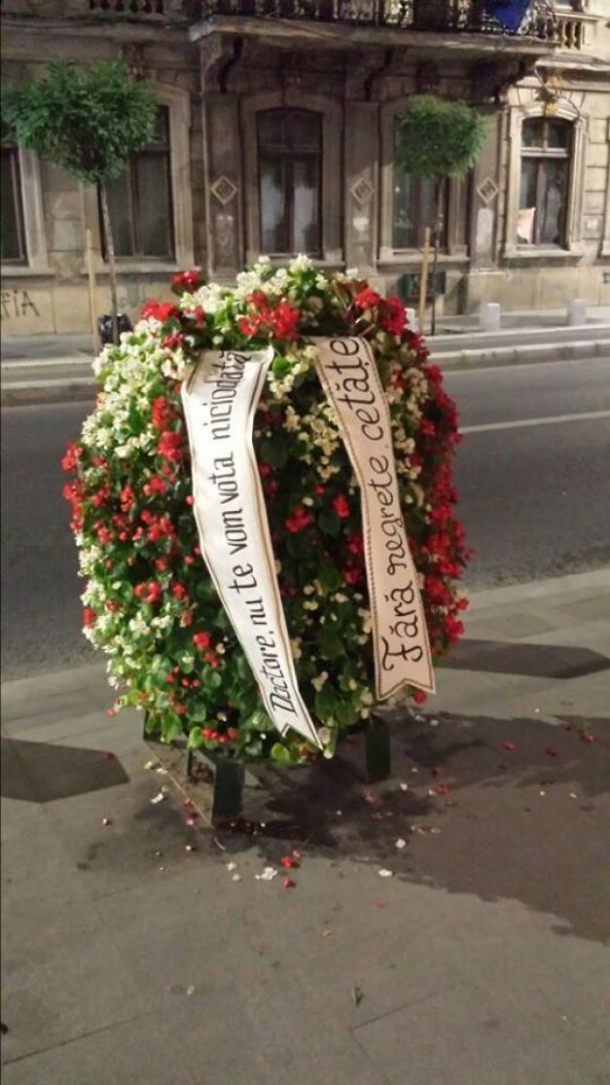 Bucureștenii i-au făcut o glumă macabră primarului Sorin Oprescu. Marți seară, pe Calea Victoriei a apărut o coroană funerară cu mesajul “Doctore, nu te vom uita niciodată!”.