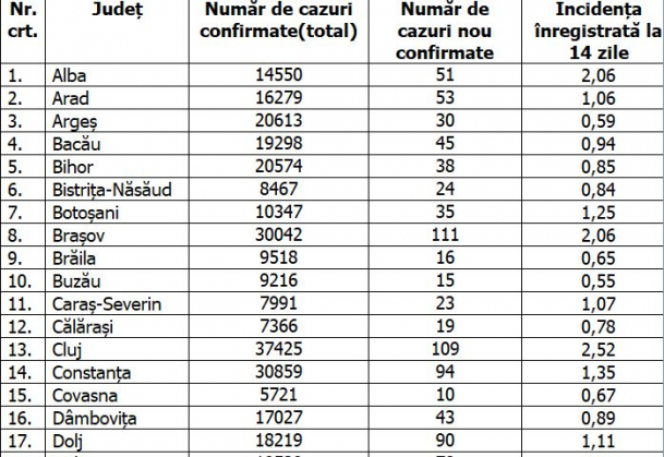 De la izbucnirea epidemiei, arată datele oficiale, cele mai multe contaminări au fost în Brașov (30042), Cluj (37425), Constanța (30859), Iași (32272), Timiș (34909) și București (122521), iar cele mai puține în Covasna (5721), Harghita (5985) șiMehedinți (5758).