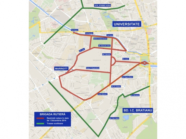 Brigada de Poliţie Rutieră va restricţiona traficul, sâmbătă şi luni, între orele 5:00 şi 14:00, pe Calea 13 Septembrie (între Bd. Tudor Vladimirescu și Bd. Libertății), strada Izvor, Bd. B. P. Hașdeu, Splaiul Independenței (între Piața Operei și Podul Națiunile Unite), Bd. Unirii (între Piaţa Constituţiei şi Bd. I. C. Brătianu), Bd. Naţiunile Unite, Bd. Libertăţii, Bd. Regina Maria (între Piaţa Libertăţii şi Piaţa Regina Maria), Bd. George Coşbuc (între Bd. Tudor Vladimirescu şi Piaţa Regina Maria) şi Calea Rahovei (între Bd. Libertăţii şi Bd. George Coşbuc).