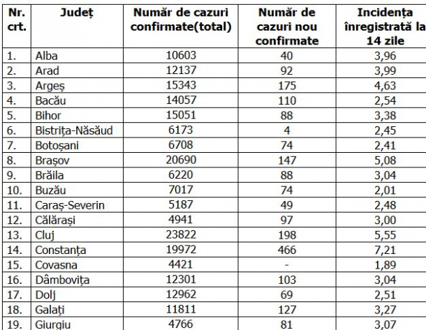 În ultimele 24 de ore, cele mai multe infectări s-au înregistrat în Argeș (175), Bacău (110), Brașov (147), Cluj (198), Constanța (466), Dâmbovița (103), Galați (127), Iași (214), Ilfov (242), Mureș (100), Sibiu (144), Timiș (128) și București (1828), iar cele mai puține în Bistrița-Năsăud (4), Harghita (6), Satu Mare (1), Sălaj (3) șiVâlcea (3).