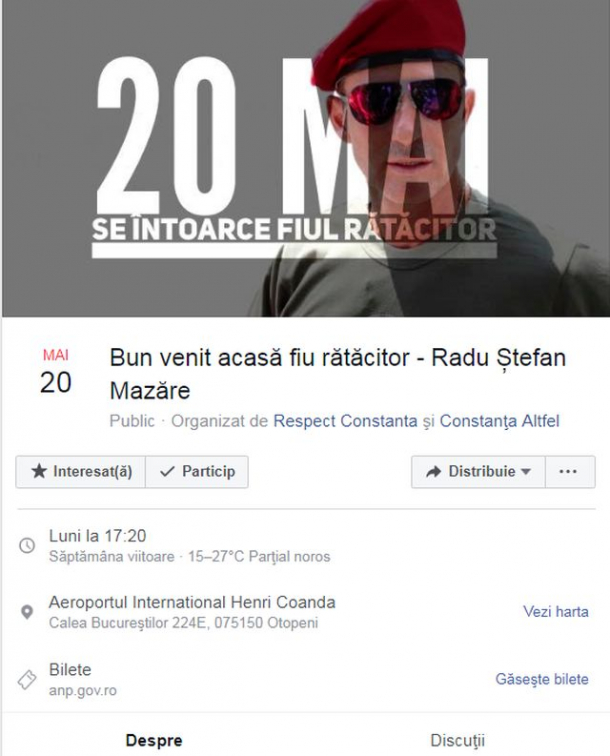 Pe Facebook, aceștia au creat un eveniment intitulat “Bun venit acasă fiu rătăcitor”, prin careromânii sunt invitați să-l aștepte la aeroport, luni, 20 mai, pe Radu Ștefan Mazăre.