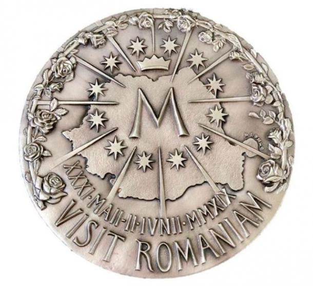 Deasupra hărții se regăsesc o coroană și 12 stele, simbol al triumfului și al victoriei. Medalia, semnată de artista Daniela Longo, prezintă un chenar de trandafiri, ce simbolizează România ca „grădină a Maicii Domnului”; în partea de jos este inscripționată data Vizitei Apostolice, în cifre latine.