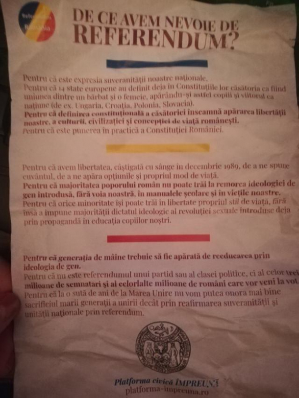 Astfel, prima măsură luată pentru informarea populației privind referendumul pentru familie a fost distribuirea de flaiere la ieșirile de la metrou.