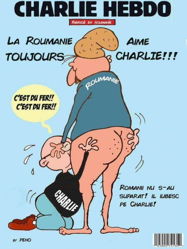 „Românii nu s-au supărat. Îl iubesc pe Charlie. Charlie Hebdo: ‘E de fier! E de fier!'”, este mesajul ataşat caricaturii, care nu mai are nevoie de niciun comentariu.