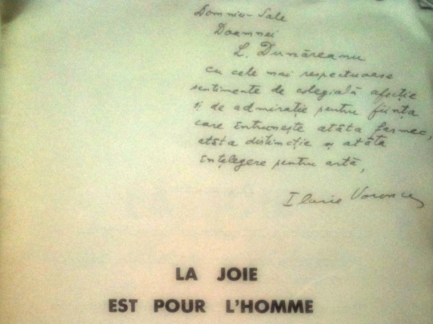 Valoarea cărţii este dată şi de autograful lui Ilarie Voronca, în fapt o dedicaţie către o anume doamnă L. Dunăreanu: “Domniei Sale, Doamnei L. Dunăreanu, cu cele mai respectuase sentimente de colegială afecţie şi de admiraţie pentru fiinţa care întruneşte atâta farmec, atâta distincţie şi atâta înţelegere pentru artă.”