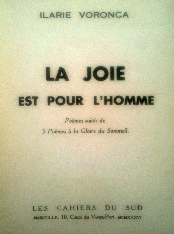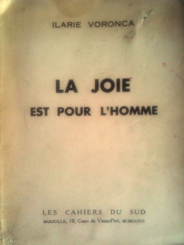 Site-ul B1.ro a reuşit să achiziţioneze miercuri, de la un anticariat din centrul Bucureştiului, ediţia princeps, cu autograf, a unui volum publicat de poetul român Ilarie Voronca la Paris, în anul 1936. Este vorba de cartea “La joie est pour l’homme. Poèmes, suivis de trois poèmes à la gloire du sommeil”, apărută la editura “Les Cahiers du Sud” din Marseille. Din acest volum de poezii s-au tipărit doar 500 de exemplare.