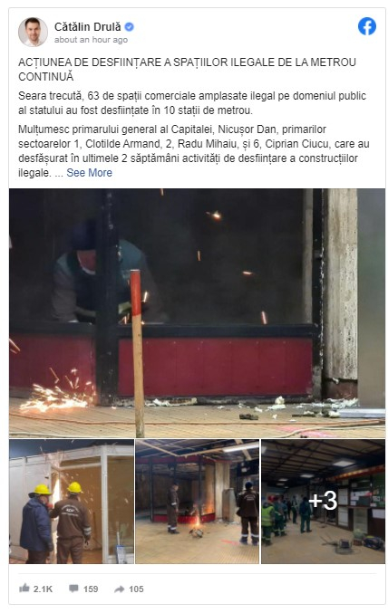 „Seara trecută, 63 de spaţii comerciale amplasate ilegal pe domeniul public al statului au fost desfiinţate în 10 staţii de metrou. Mulţumesc primarului general al Capitalei, Nicuşor Dan, primarilor sectoarelor 1, Clotilde Armand, 2, Radu Mihaiu, şi 6, Ciprian Ciucu, care au desfăşurat în ultimele 2 săptămâni activităţi de desfiinţare a construcţiilor ilegale. Ieri seară, într-o acţiune amplă, primăria sectorului 4 a desfiinţat spaţii ilegale din 7 staţii de metrou (Piaţa Unirii 1, Constantin Brâncoveanu, Piaţa Sudului, Eroii Revoluţiei, Apărătorii Patriei, Tineretului, Timpuri Noi). Mulţumesc d-lui. primar Băluţă pentru mobilizarea excelentă”, a transmis ministrul.