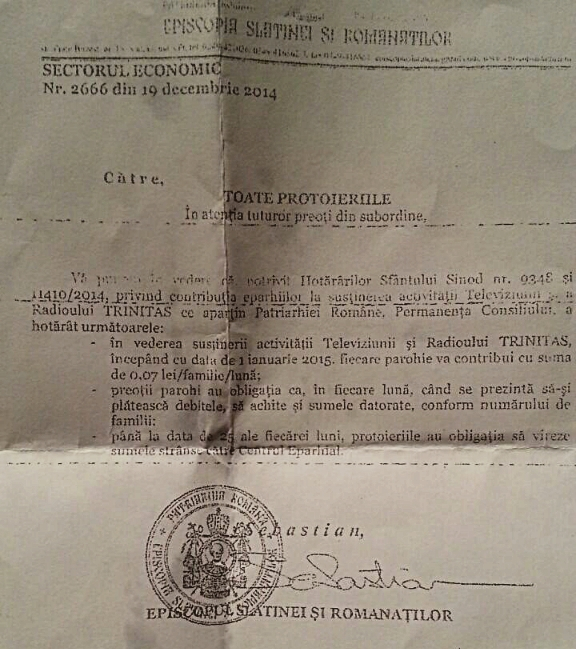 Episcopiei Slatinei și Romanaților cere ca fiecare familie să cotizele către televiziunea BOR, Trinitas. Ordinul a intrat în vigoare de la 1 ianuarie 2015.