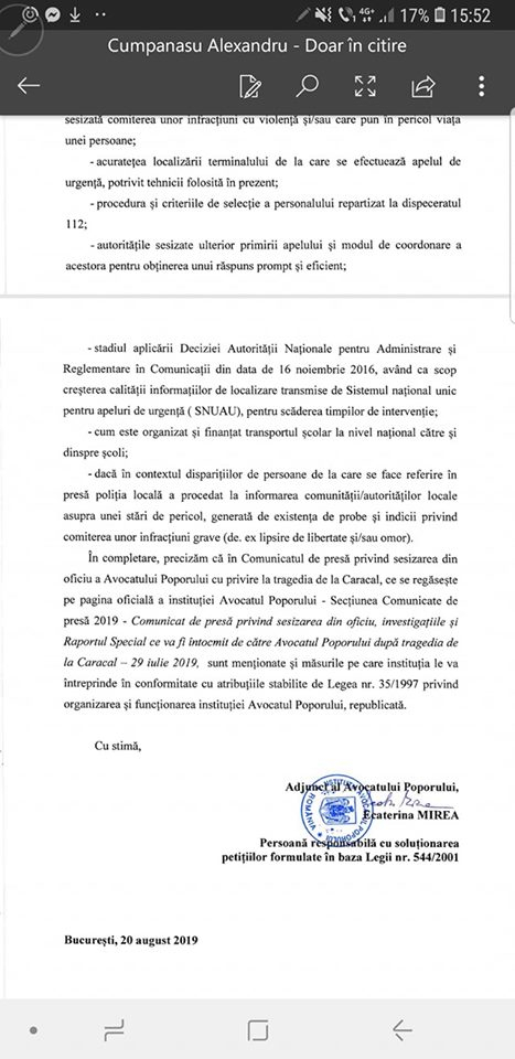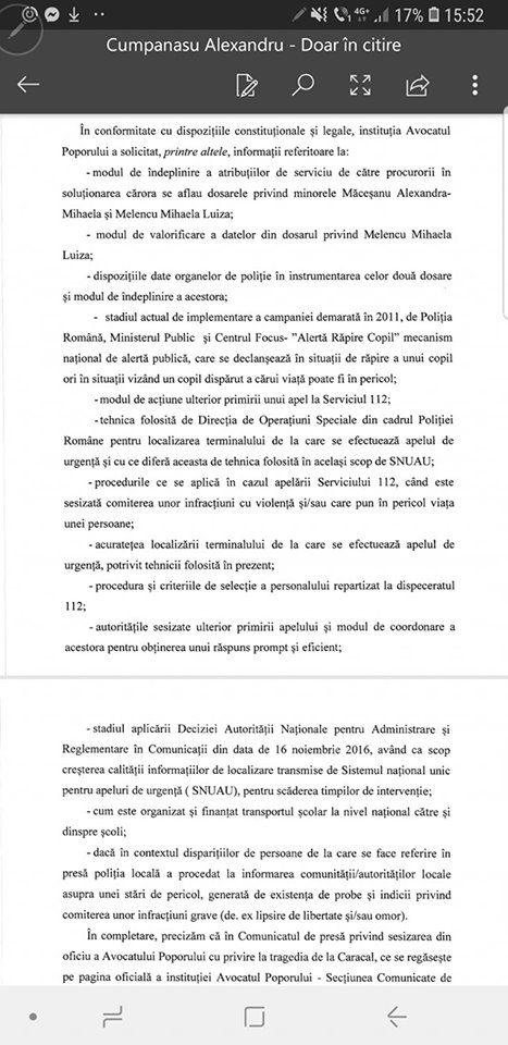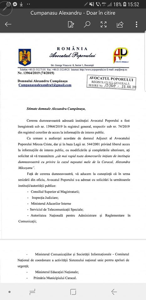 Alexandru Cumpănașu, unchiul Alexandrei Măceșanu, a publicat pe Facebook răspunsul primit de la Avocatul Poporului în legătură cu cazul crimelor de la Caracal.