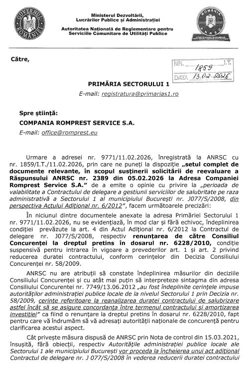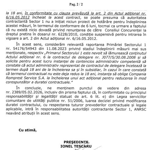 Romprest mai afirmă că există un proces pe rolul Tribunalul București pentru constatarea duratei contractului, iar Autoritatea Națională de Reglementare pentru Serviciile Comunitare de Utilități Publice a arătat că nu există dovada indeplinirii conditiilor pentru încetarea contractului la 30.06.2026. O decizie luată înainte de clarificarea instanței poate însemna despăgubiri uriașe plătite din banii cetățenilor.