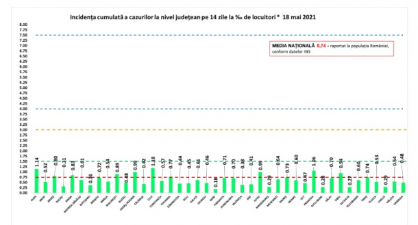 În acest moment, niciun județ nu mai depășește rata de infectare de 1,18 la mia de locuitori, înregistrată în Cluj. În afară de aceasta, rata rămâne peste 1 doar în Arad: 1,14.