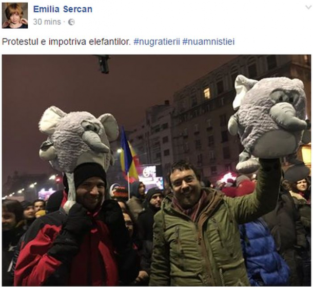 Doi tineri au venit la manifestație însoțiți de două jucării din pluș în formă de elefanți, imaginea fiind potată pe Facebook de jurnalista Emilia Șercan.